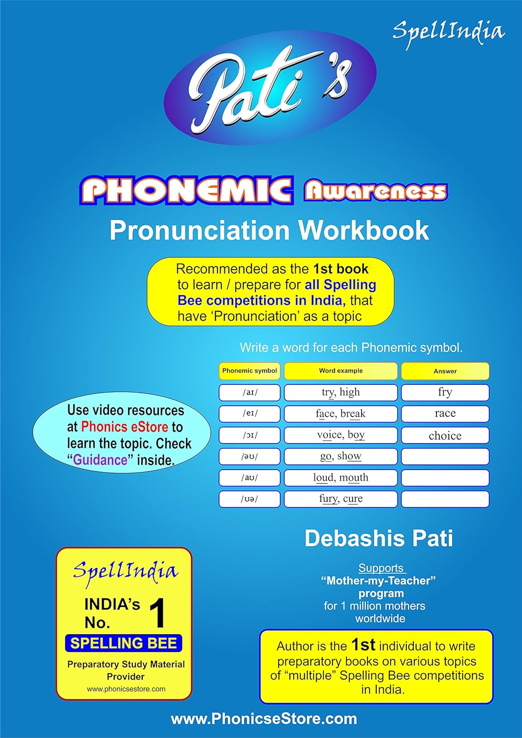 The workbook is designed for children preparing for MARRS Spelling Bee competition exams - Pronunciation - Phonemic Awareness. It includes the first step for learning Phonemic symbols and Sounds. This workbook is a MUST AS 1st STEP FOR LEARNING PRONUNCIATION for first timers of Category 1, Category 2, Category 3, Category 4, Category 5 and Category 6. . . . You may buy individual books as well as STUDY SETS at amazon. Study Sets are available category wise and round wise. . Before buying an individual book do check the study set. It is a cost friendly option and provides completeness to your preparation. These were started in May 2017 and in its first year it has been part of the study material of many including the most successful participating child in the year. The COVER IMAGE of each Study Set states the topics / books included. The study sets available are listed here. For each the code to be used to search at amazon is also provided for your convenience. . CATEGORY 1 ROUND 1 : B076C65TZ4 . CATEGORY 1 ROUND 2 : B071JN6PF4 . CATEGORY 1 ROUND 3 : B07211DWV2 . CATEGORY 1 ROUND 4 : B071G2BBPC . CATEGORY 1 ROUND 5 : B072WNXX7Q . CATEGORY 2 ROUND 1 : B072WLS26T . CATEGORY 2 ROUND 2 : B071G2BGCK . CATEGORY 2 ROUND 3 : B071WLCYX7 . CATEGORY 2 ROUND 4 : B071G2BBPC . CATEGORY 2 ROUND 5 : B072WNXX7Q If you are from UAE we will make arrangements to reach you. Do connect with us. . These study material are made available as part of "Spell India" initiative. . We strive to make winners out of participants. .