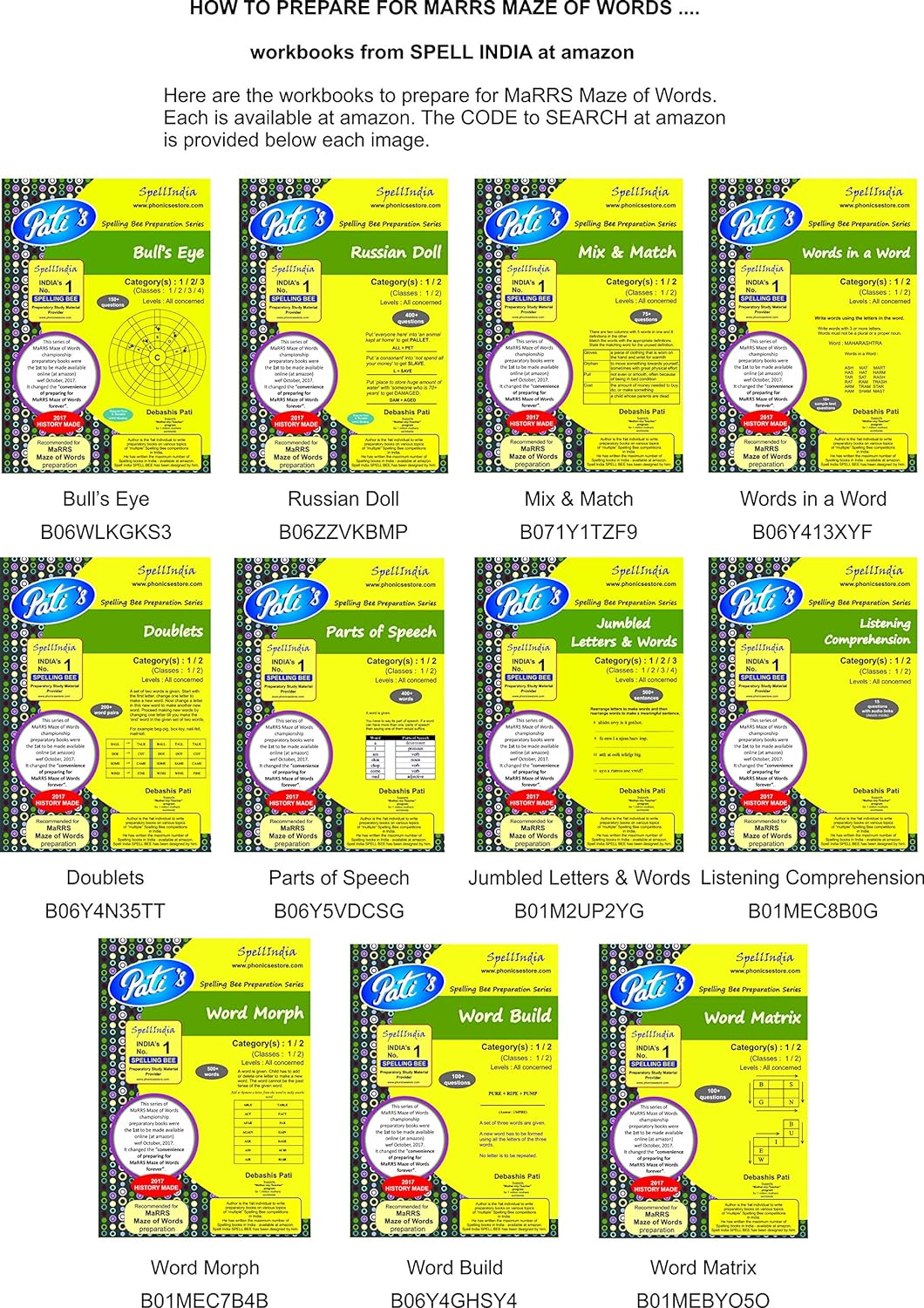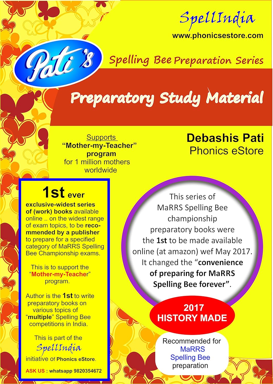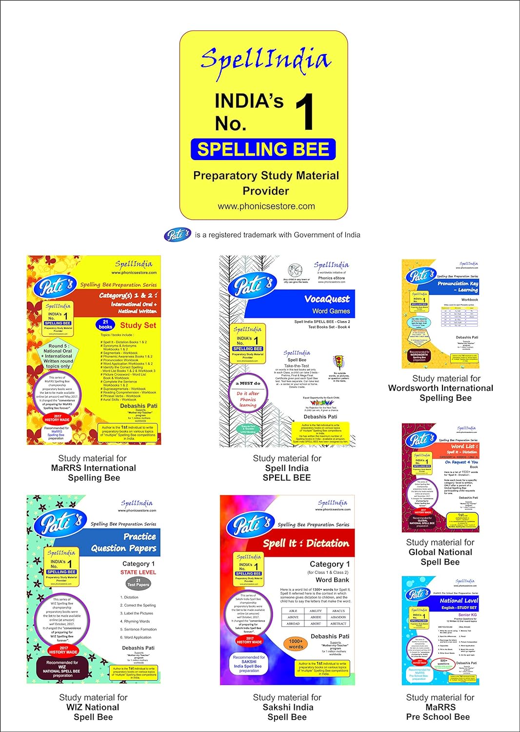 A set of study material to prepare for Marrs Spelling Bee - Category 2 - Round 3 - State Written & Inter School Oral level exam. PLEASE CHECK topics on the image for clarity. . . You may buy individual books as well as STUDY SETS at amazon. Study Sets are available category wise and round wise. . Before buying an individual book do check the study set. It is a cost friendly option and provides completeness to your preparation. These were started in May 2017 and in its first year it has been part of the study material of many including the most successful participating child in the year. The COVER IMAGE of each Study Set states the topics / books included. The study sets available at amazon are listed here. For each the code to be used to search at amazon is also provided for your convenience. . CATEGORY 1 ROUND 1 : B076C65TZ4 . CATEGORY 1 ROUND 2 : B071JN6PF4 . CATEGORY 1 ROUND 3 : B07211DWV2 . CATEGORY 1 ROUND 4 : B071G2BBPC . CATEGORY 1 ROUND 5 : B072WNXX7Q . CATEGORY 2 ROUND 1 : B072WLS26T . CATEGORY 2 ROUND 2 : B071G2BGCK . CATEGORY 2 ROUND 3 : B071WLCYX7 . CATEGORY 2 ROUND 4 : B071G2BBPC . CATEGORY 2 ROUND 5 : B072WNXX7Q . . For pre purchase queries whatsapp +91 9820354672. If you are from UAE we will make arrangements to reach you. Do connect with us. . These study material are made available as part of "Spell India" initiative. . We strive to make winners out of participants. . We are just a whatsapp away +91 9820354672 ........................ Along with this study set (now) comes a free copy of "VocaQuest - 80+ % Vocabulary" worth Rs 299 at amazon amazon code : B01M2UP58A). It is a word list book of 2500+words for spelling learning.