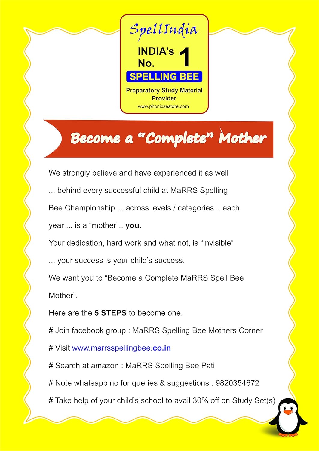 Prepare your child for Pronunciation - Phonemic Awareness …. MaRRS Spelling Bee competition exam - Category 1 & Category 2. (Class 1 & Class 2) Here are 1000+ words with phonemic script for practice (without clue). There is a Book 2 as well for Category 1 & Category 2. And to start off on this topic it is advised that you go for the Pronunciation Workbook by the author available at amazon. . . . You may buy individual books as well as STUDY SETS at amazon. Study Sets are available category wise and round wise. . Before buying an individual book do check the study set. It is a cost friendly option and provides completeness to your preparation. These were started in May 2017 and in its first year it has been part of the study material of many including the most successful participating child in the year. The COVER IMAGE of each Study Set states the topics / books included. The study sets available are listed here. For each the code to be used to search at amazon is also provided for your convenience. . CATEGORY 1 ROUND 1 : B076C65TZ4 . CATEGORY 1 ROUND 2 : B071JN6PF4 . CATEGORY 1 ROUND 3 : B07211DWV2 . CATEGORY 1 ROUND 4 : B071G2BBPC . CATEGORY 1 ROUND 5 : B072WNXX7Q . CATEGORY 2 ROUND 1 : B072WLS26T . CATEGORY 2 ROUND 2 : B071G2BGCK . CATEGORY 2 ROUND 3 : B071WLCYX7 . CATEGORY 2 ROUND 4 : B071G2BBPC . CATEGORY 2 ROUND 5 : B072WNXX7Q . . For pre purchase queries whatsapp +91 9820354672. If you are from UAE we will make arrangements to reach you. Do connect with us. . These study material are made available as part of "Spell India" initiative. . We strive to make winners out of participants. . We are just a whatsapp away +91 9820354672