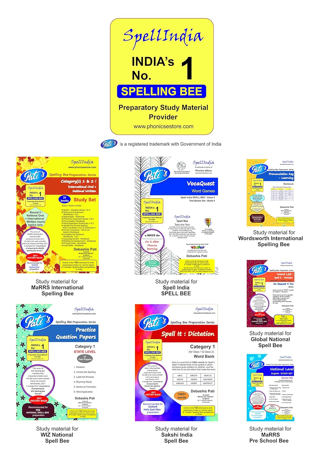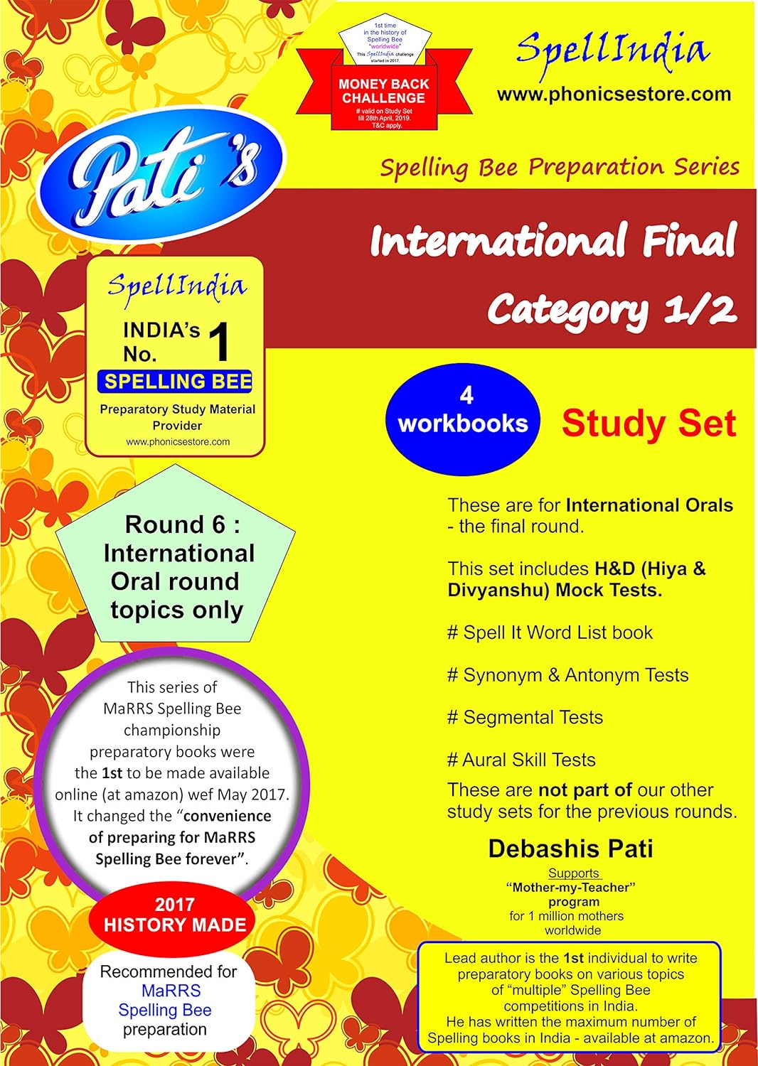 This is a STUDY SET of 4 books (covering each topic of International oral round) to prepare your child for Category(s) 1 & 2 - Round 6 - International Oral of MARRS Spelling Bee championship. It includes 4 topics: Spell It (word list book), Synonyms & Antonyms, Segmentals and Aural Skills. NONE OF THESE 4 BOOKS ARE PART OF OUR PREVIOUS STUDY SETS. ...... . You may buy individual books on concerned topics as well as STUDY SETS at amazon. Study Sets are available category wise and round wise. Before buying an individual book do check the study set. It is a cost friendly option and provides completeness to your preparation. These were started in May 2017 and in its first year it has been part of the study material of many including the most successful participating child in the year. The COVER IMAGE of each Study Set states the topics / books included. The study sets available are listed here. For each the code to be used to search at amazon is also provided for your convenience. . CATEGORY 1 ROUND 1 : B076C65TZ4 . CATEGORY 1 ROUND 2 : B071JN6PF4 . CATEGORY 1 ROUND 3 : B07211DWV2 . CATEGORY 1 ROUND 4 : B071G2BBPC . CATEGORY 1 ROUND 5 : B072WNXX7Q . CATEGORY 2 ROUND 1 : B072WLS26T . CATEGORY 2 ROUND 2 : B071G2BGCK . CATEGORY 2 ROUND 3 : B071WLCYX7 . CATEGORY 2 ROUND 4 : B071G2BBPC . CATEGORY 2 ROUND 5 : B072WNXX7Q . . For pre purchase queries whatsapp +91 9820354672. If you are from UAE we will make arrangements to reach you. Do connect with us. . These study material are made available as part of "Spell India" initiative. . We strive to make winners out of participants. . We are just a whatsapp away +91 9820354672