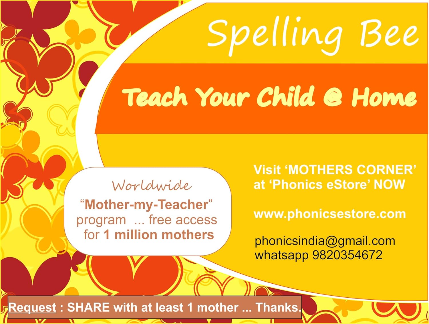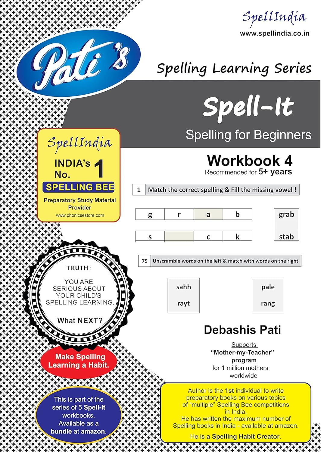 Spell India is a Phonics eStore initiative. It is India's No 1 preparatory study material for Spelling Bee competition exams in India. This is a special set of 5 workbooks for Spelling Learning for Beginners. TAKE 'Spell Bee' TESTS after completing each workbook ... this is "1st of its kind Spell Bee initiative in India as well as worldwide". The tests are "not chargeable" and fully supported by the author - whose personal mission is to make every child in India "Phonics and Spelling literate" at the lowest cost and with ease at an early life stage - around 5 years old ... by when the brain development is claimed to be over 80%. The author strongly recommends each parent of a Junior Kg child to take off from the summer vacation before Senior Kg starts. For pre purchase queries whatsapp 9820354672.