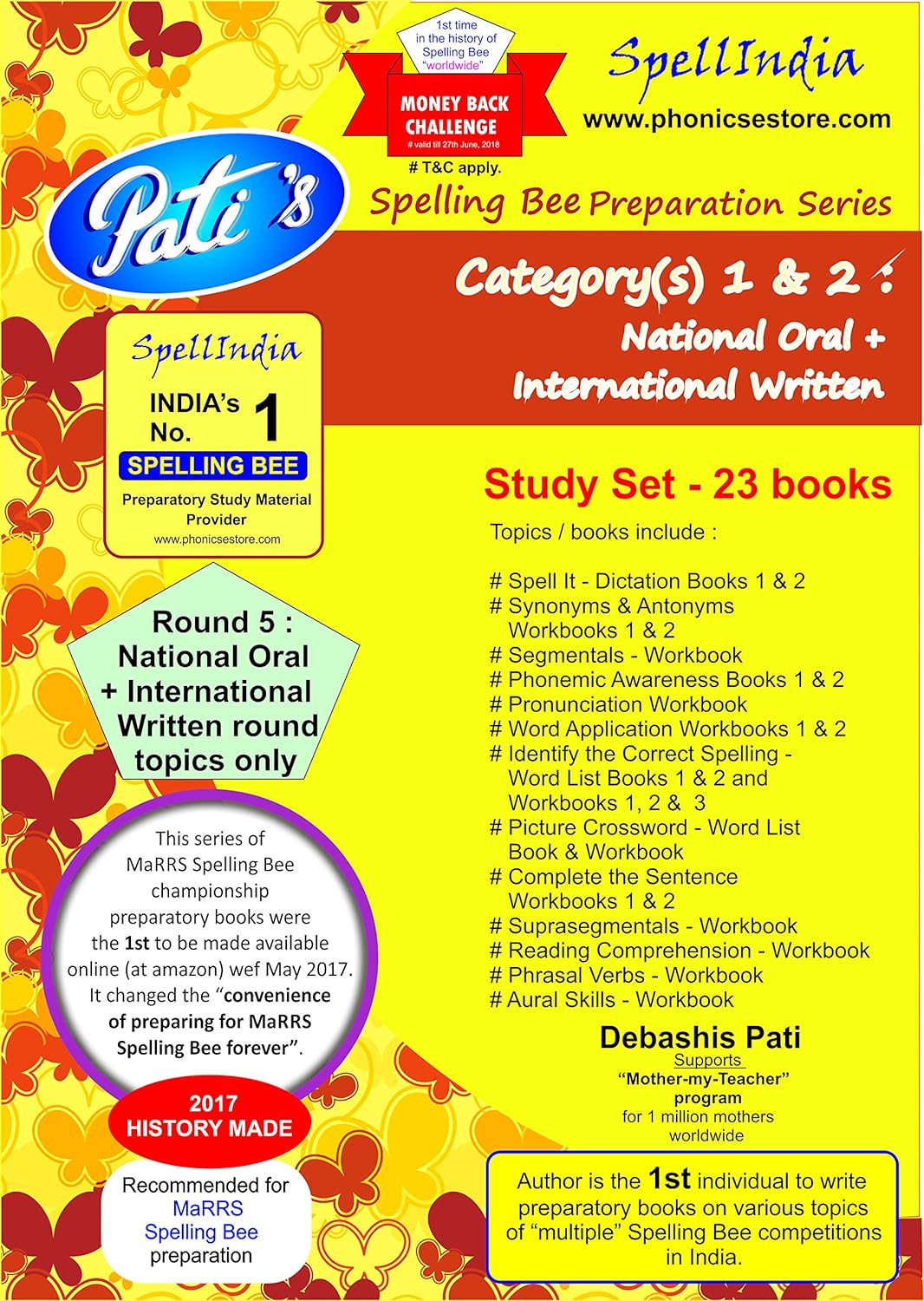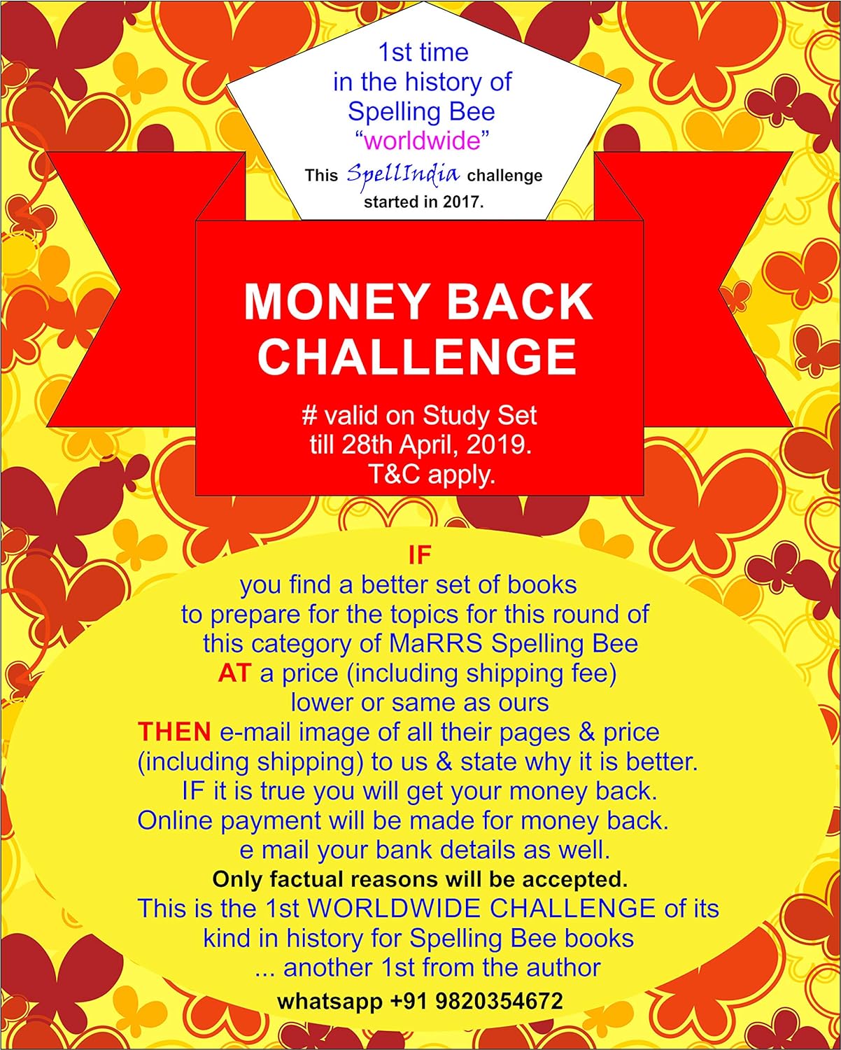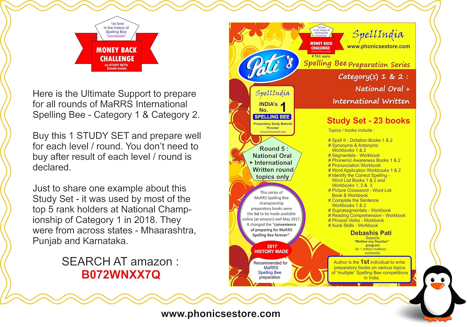 This is a STUDY SET of 23 books (covering each topic of National oral and International written round) to prepare your child for Category(s) 1 & 2 - Round 4 - State Oral and National Written of Marrs Spelling Bee championship. It includes 12 topics (through 23 books) : Spell It, Synonyms & Antonyms, Segmentals, Phonemic Awareness, Word Application, Identify the Correct Spelling, Picture Crossword, Complete the Sentence, Suprasegmentals, Reading Comprehension, Phrasal Verbs and Aural Skills. If you have purchased our study set of previous rounds then you may buy additional individual books only. Do check out MONEY BACK CHALLENGE (refer attached image)...... . You may buy individual books as well as STUDY SETS at amazon. Study Sets are available category wise and round wise. . Before buying an individual book do check the study set. It is a cost friendly option and provides completeness to your preparation. These were started in May 2017 and in its first year it has been part of the study material of many including the most successful participating child in the year. The COVER IMAGE of each Study Set states the topics / books included. The study sets available are listed here. For each the code to be used to search at amazon is also provided for your convenience. . CATEGORY 1 ROUND 1 : B076C65TZ4 . CATEGORY 1 ROUND 2 : B071JN6PF4 . CATEGORY 1 ROUND 3 : B07211DWV2 . CATEGORY 1 ROUND 4 : B071G2BBPC . CATEGORY 1 ROUND 5 : B072WNXX7Q . CATEGORY 2 ROUND 1 : B072WLS26T . CATEGORY 2 ROUND 2 : B071G2BGCK . CATEGORY 2 ROUND 3 : B071WLCYX7 . CATEGORY 2 ROUND 4 : B071G2BBPC . CATEGORY 2 ROUND 5 : B072WNXX7Q . . For pre purchase queries whatsapp +91 9820354672. If you are from UAE we will make arrangements to reach you. Do connect with us. . These study material are made available as part of "Spell India" initiative. . We strive to make winners out of participants. . We are just a whatsapp away +91 9820354672