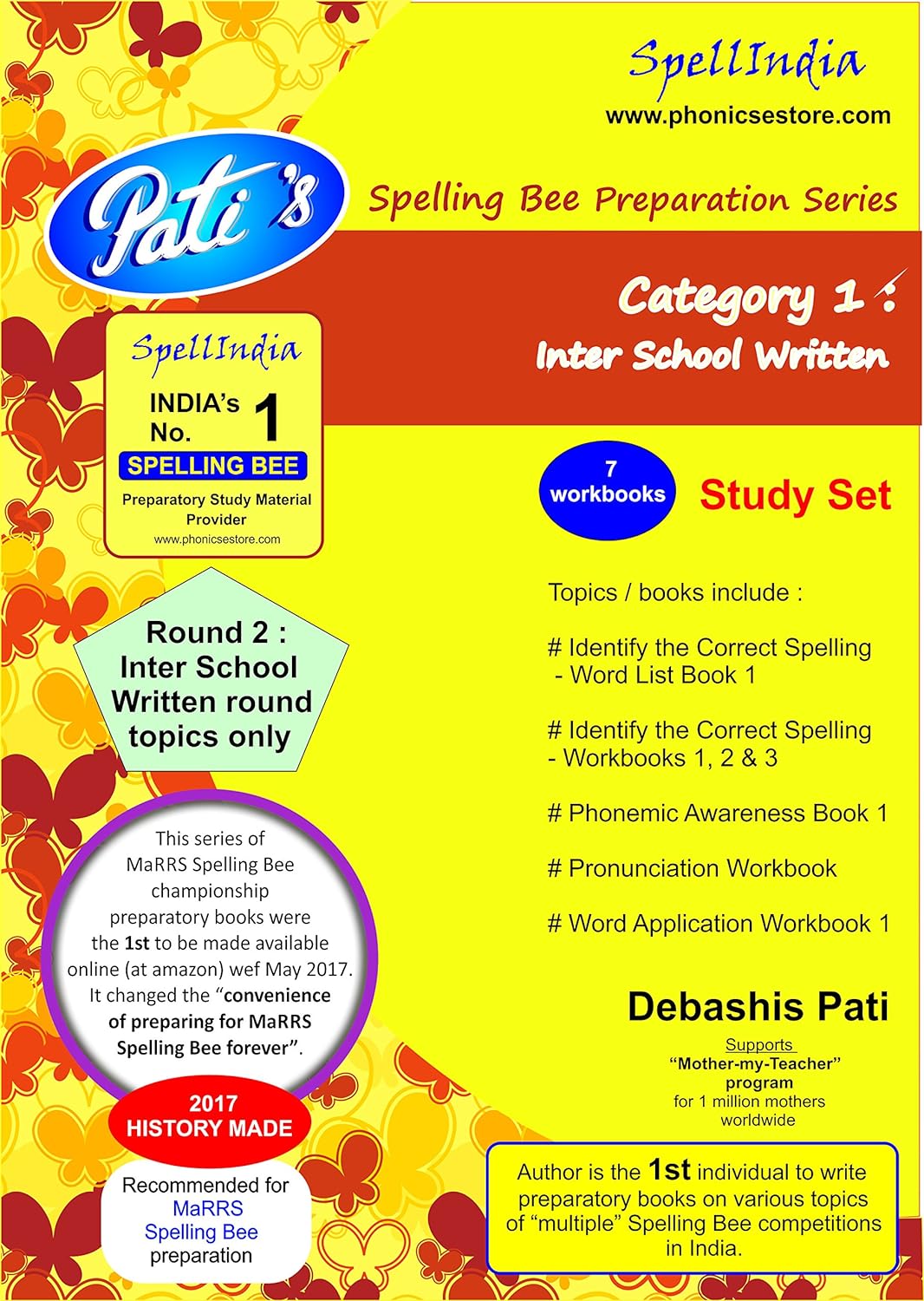 This is a STUDY SET of 19 books (covering each topic of State oral and National written round) to help you, prepare your child for Category(s) 1 & 2 - Round 4 - State Oral and National Written of Marrs Spelling Bee championship. It includes 10 topics (through 19 books) : Spell It, Synonyms & Antonyms, Segmentals, Phonemic Awareness, Word Application, Identify the Correct Spelling, Picture Crossword, Complete the Sentence, Suprasegmentals and Reading Comprehension. . . . You may buy individual books as well as STUDY SETS at amazon. Study Sets are available category wise and round wise. . Before buying an individual book do check the study set. It is a cost friendly option and provides completeness to your preparation. These were started in May 2017 and in its first year it has been part of the study material of many including the most successful participating child in the year. The COVER IMAGE of each Study Set states the topics / books included. The study sets available are listed here. For each the code to be used to search at amazon is also provided for your convenience. . CATEGORY 1 ROUND 1 : B076C65TZ4 . CATEGORY 1 ROUND 2 : B071JN6PF4 . CATEGORY 1 ROUND 3 : B07211DWV2 . CATEGORY 1 ROUND 4 : B071G2BBPC . CATEGORY 1 ROUND 5 : B072WNXX7Q . CATEGORY 2 ROUND 1 : B072WLS26T . CATEGORY 2 ROUND 2 : B071G2BGCK . CATEGORY 2 ROUND 3 : B071WLCYX7 . CATEGORY 2 ROUND 4 : B071G2BBPC . CATEGORY 2 ROUND 5 : B072WNXX7Q . . For pre purchase queries whatsapp +91 9820354672. If you are from UAE we will make arrangements to reach you. Do connect with us. . These study material are made available as part of "Spell India" initiative. . We strive to make winners out of participants. . We are just a whatsapp away +91 9820354672