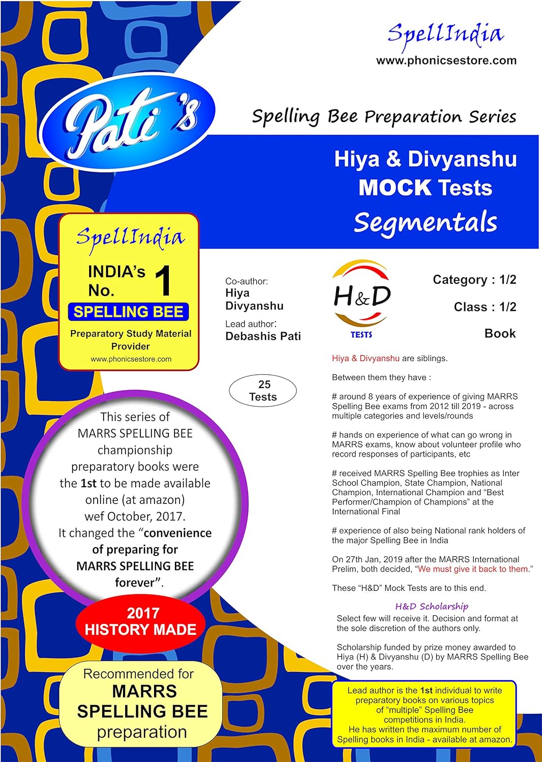 This is a book with 25 MOCK TESTS for Segmentals ... to prepare for MaRRS Spelling Bee Championship exams - Categories 1 and 2 ... Classes 1 and 2 .... These have been prepared along with two participants Hiya & Divyanshu (H & D) ...... PLEASE READ DETAILS ON COVER PAGE before purchase.